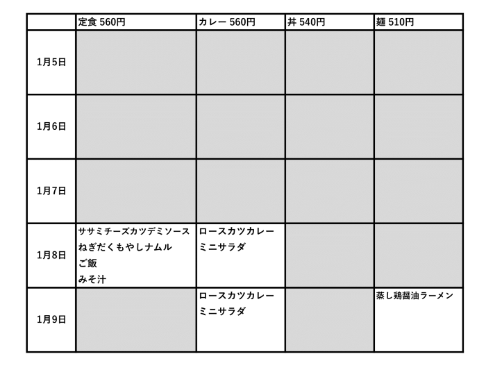 【今週のメニュー】附属中学校食堂 12月8日~2026年1月9日 富山大学生協 附属中学校食堂メニュー情報 毎度ご利用ありがとうございます。こちらで、1週間のメニューをお知らせしております。(急遽、当日メニュー変更があった場合はご容赦下さい)本年もありがとうございました。2026年もよろしくお願いします。12月8日から12月15日から2026年1月8日から 関連情報 戻る