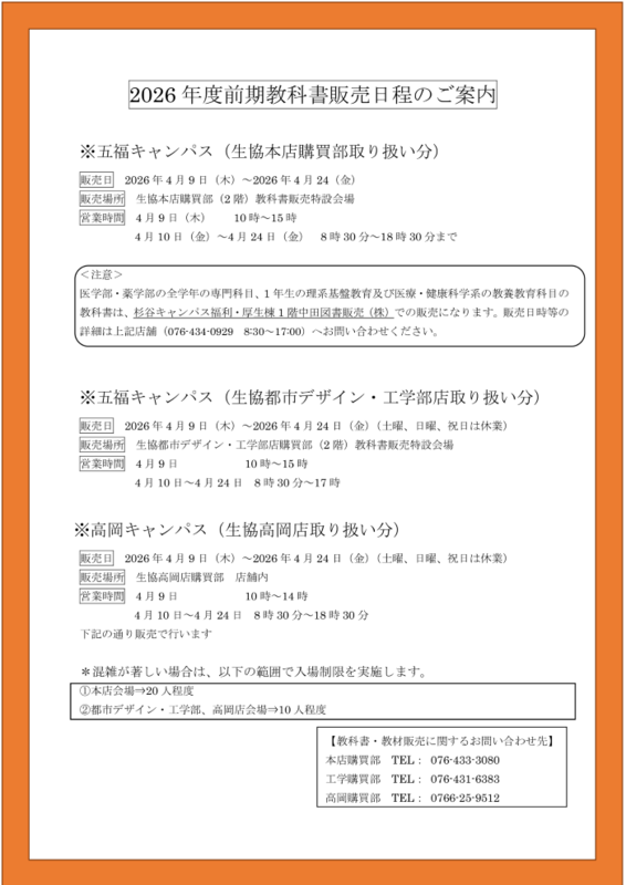 2026前期教科書販売のお知らせ (2026年4月2日)